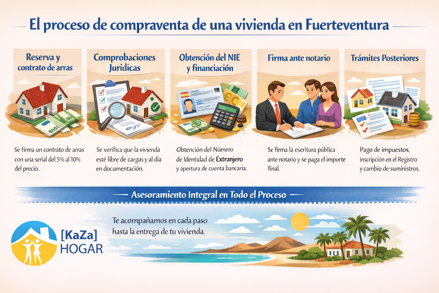 El proceso de compraventa de una vivienda en Fuerteventura sigue una serie de pasos estructurados que garantizan la seguridad jurídica tanto del comprador como del vendedor, desde la reserva inicial hasta la firma ante notario y los trámites posteriores. Reserva y contrato de arras El primer paso habitual consiste en la firma de un contrato de reserva o de arras, acompañado del pago de una...