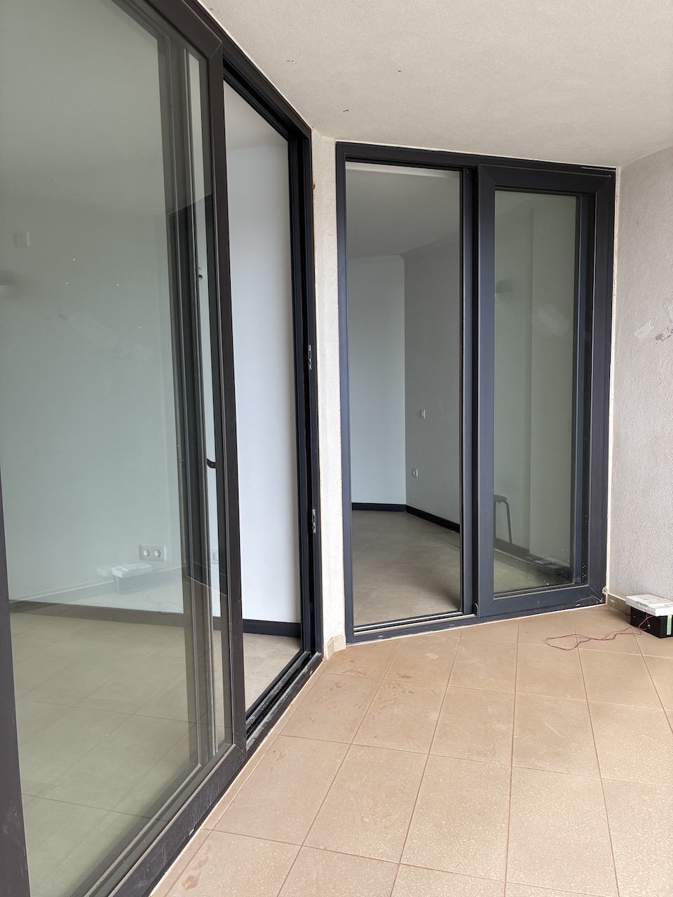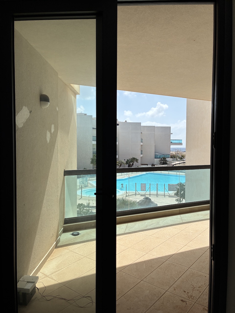 On the lower level, the property offers a more private and tranquil environment, featuring a second double bedroom with direct access to the patio through sliding glass doors. A second bathroom serves this floor, along with an additional adaptable space that can function as a third bedroom, a second kitchen, or leisure area depending on lifestyle needs. Residents of the complex enjoy a well-maintained communal pool, sunbathing areas, and landscaped gardens, all within a quiet setting just steps from the beach and close to local amenities.